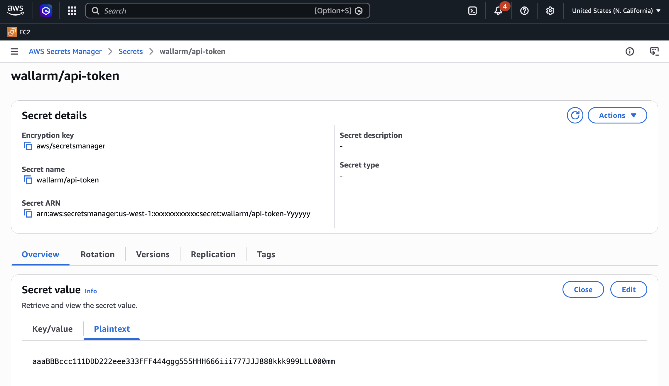 The secret must be in the same AWS region as your Wallarm Node EC2 instance.