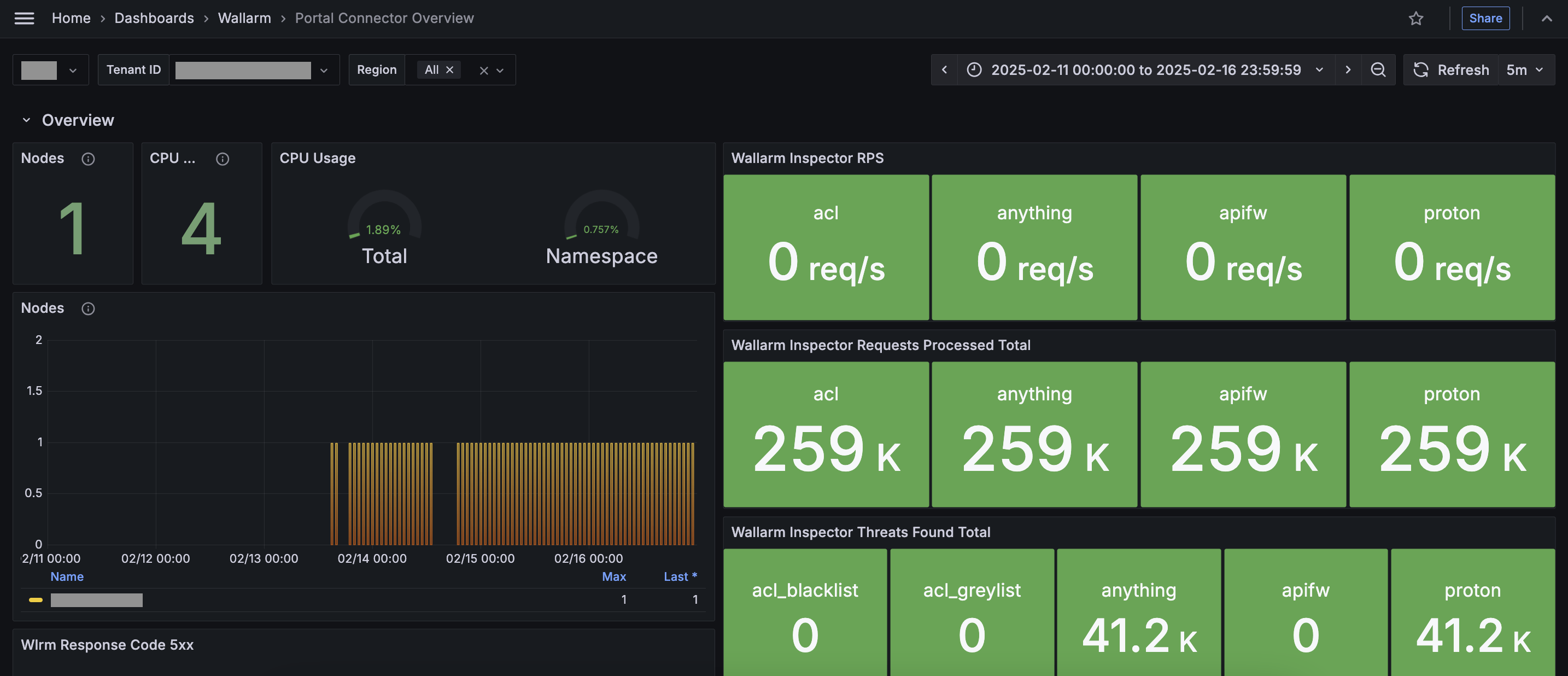 From the Grafana home page, to reach the dashboard, navigate to Dashboards โ Wallarm โ Portal Connector Overview. For multiple Nodes, switch the Tenant ID corresponding to the connector endpoint to view each dashboard.
