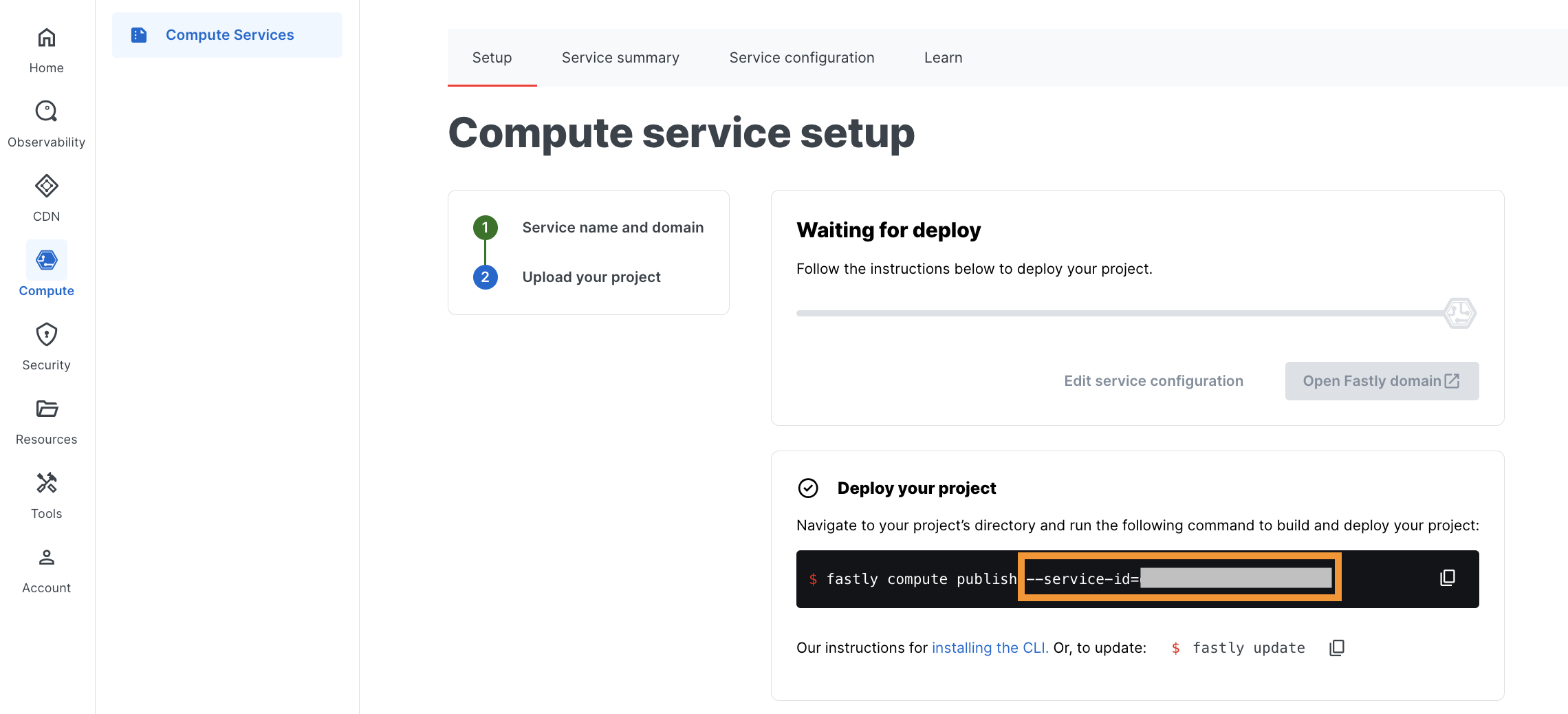 3. Go to Fastly UI → ComputeCompute servicesCreate serviceUse a local project and create an instance for Wallarm.