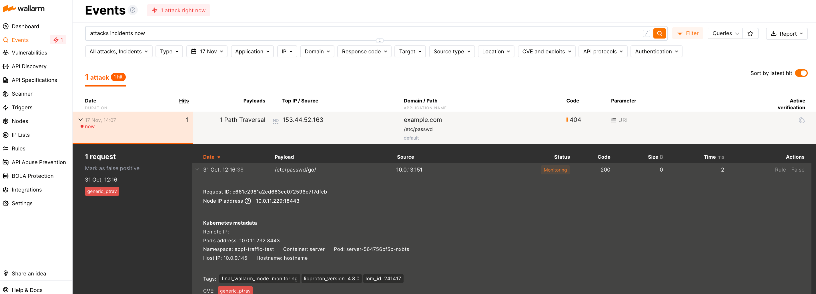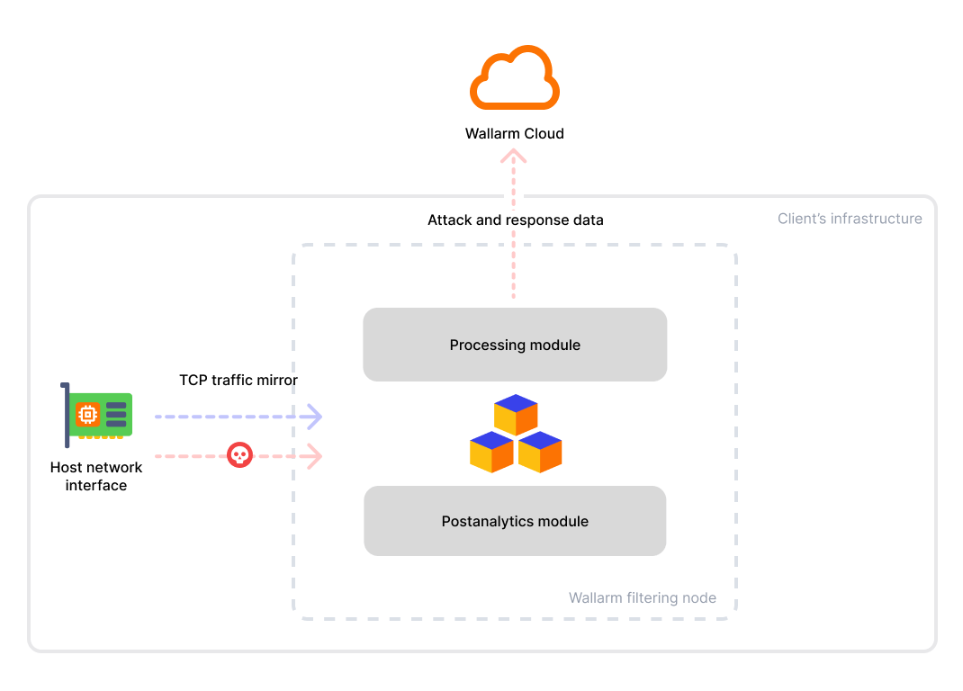 Since the Wallarm solution for TCP traffic mirror analysis operates out-of-band, it does not block attacks but only registers them.