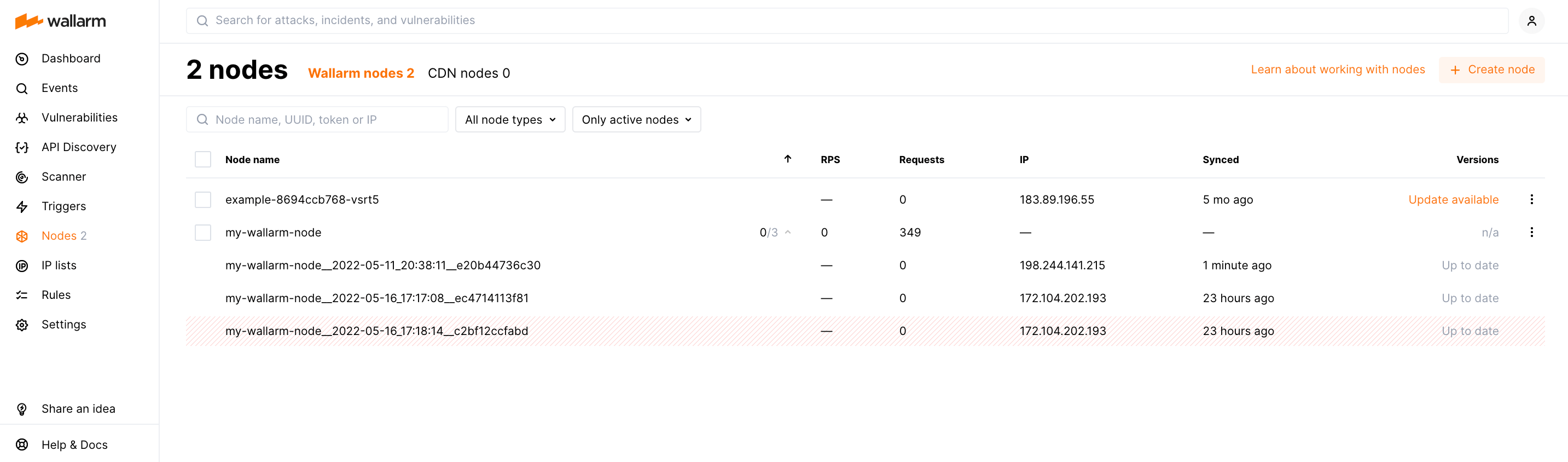 The Nodes section of the Wallarm Console allows you to manage self-hosted nodes (Security Edge nodes are managed separately).