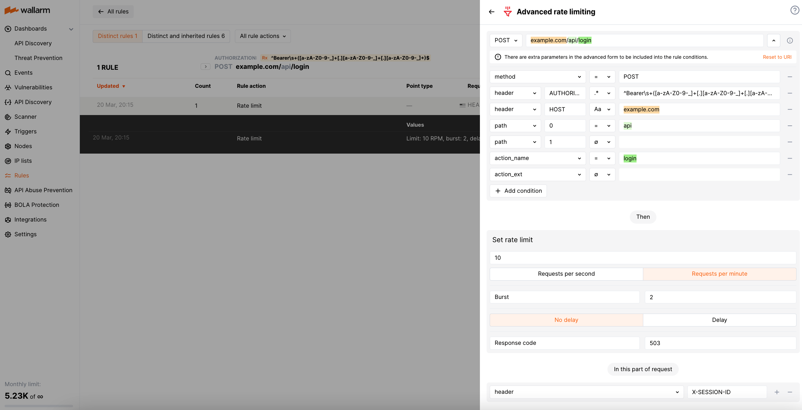 Suppose your application assigns each user session with a unique ID and reflects it in the X-SESSION-ID header. The API endpoint at the URL https://example.com/api/login accepts POST requests that include a Bearer JWT in the Authorization header. For this scenario, the rule limiting connections by sessions will appear as follows: