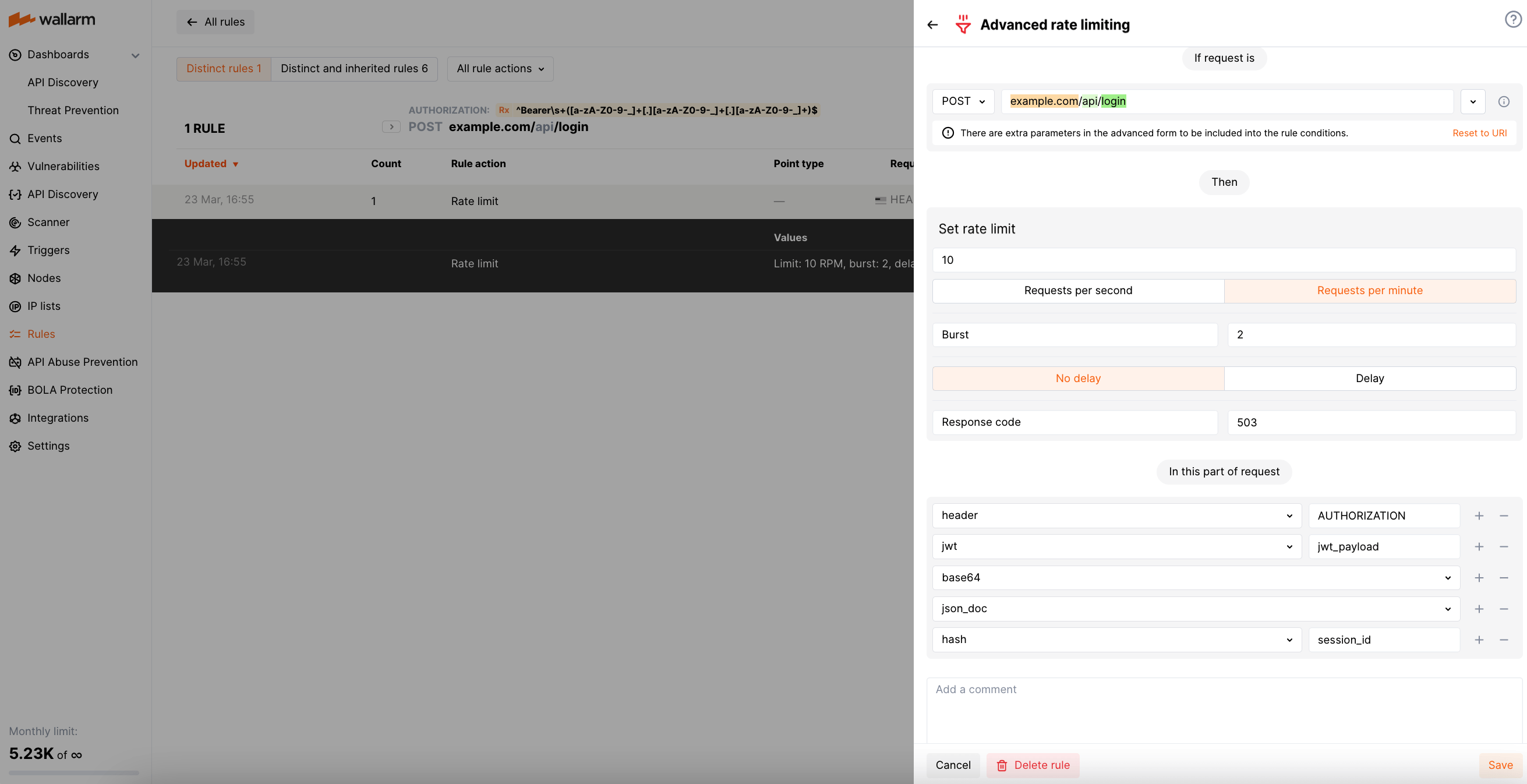 ngx_http_limit_req_moduleNGINX module) and you also apply the Wallarm rule, the web server rejects requests by the configured rules but Wallarm does not. -