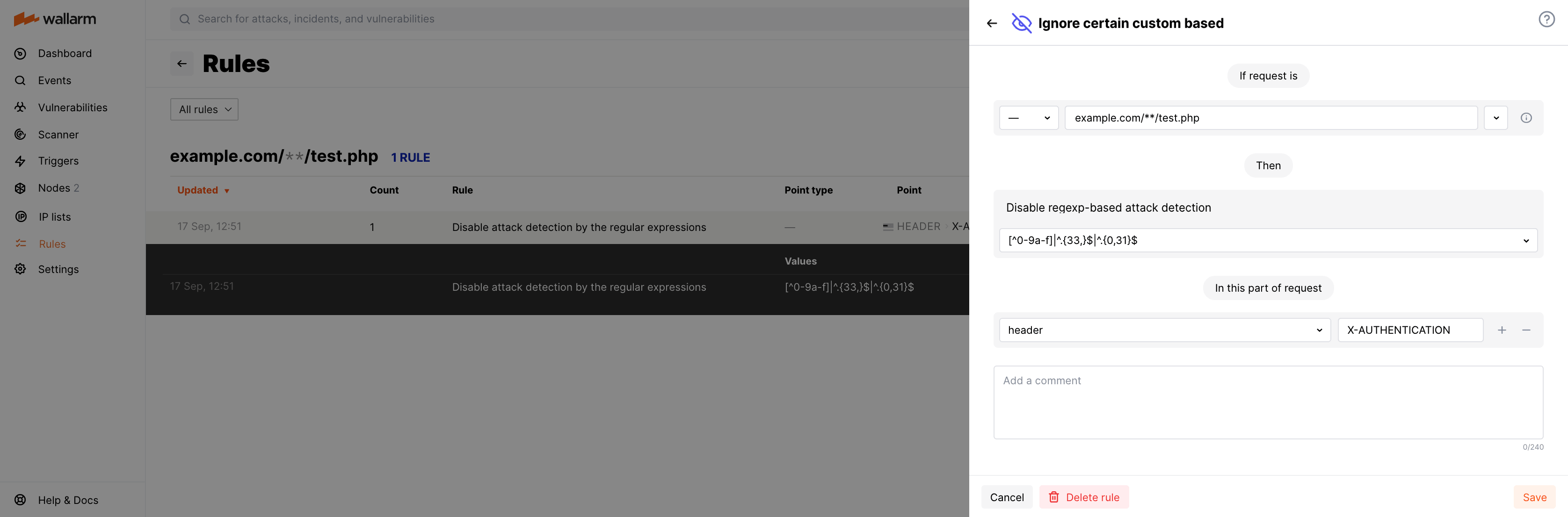 Wallarm provides the Create regexp-based attack indicator rule to define your own attack signs that are described with the regular expressions.