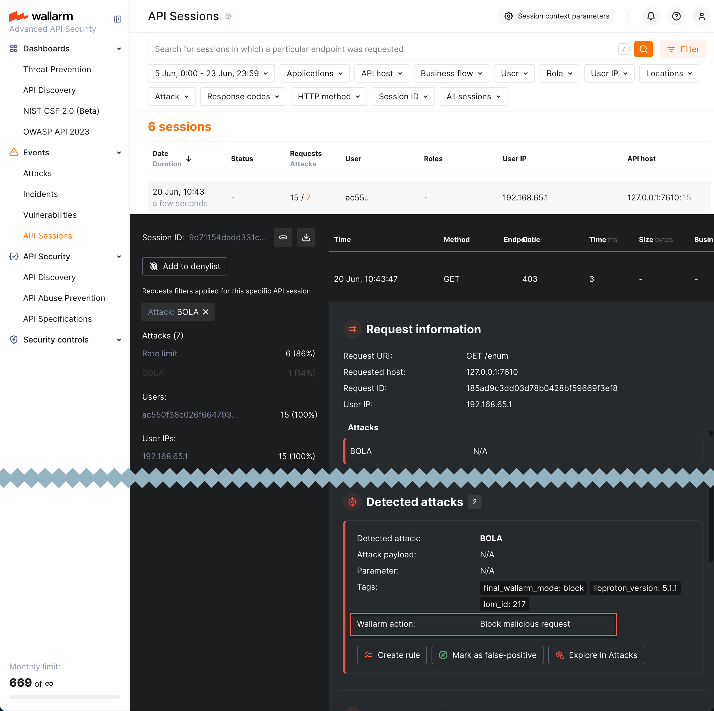 As Wallarm's API Sessions aim to provide full visibility into sessions within your traffic, this visibility includes information about Wallarm intervention into session's traffic flow, particularly, request that were by different reasons defined as part of attack, marked as such and, if configured, blocked.