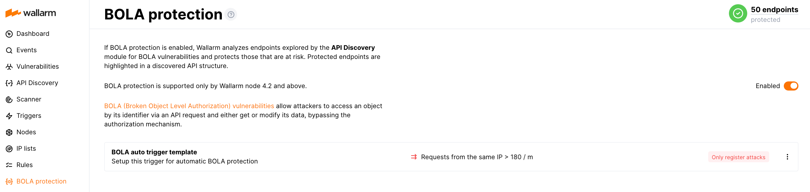 Para habilitar a autoproteção, vá para o console Wallarm → Proteção BOLA e ative a opção: