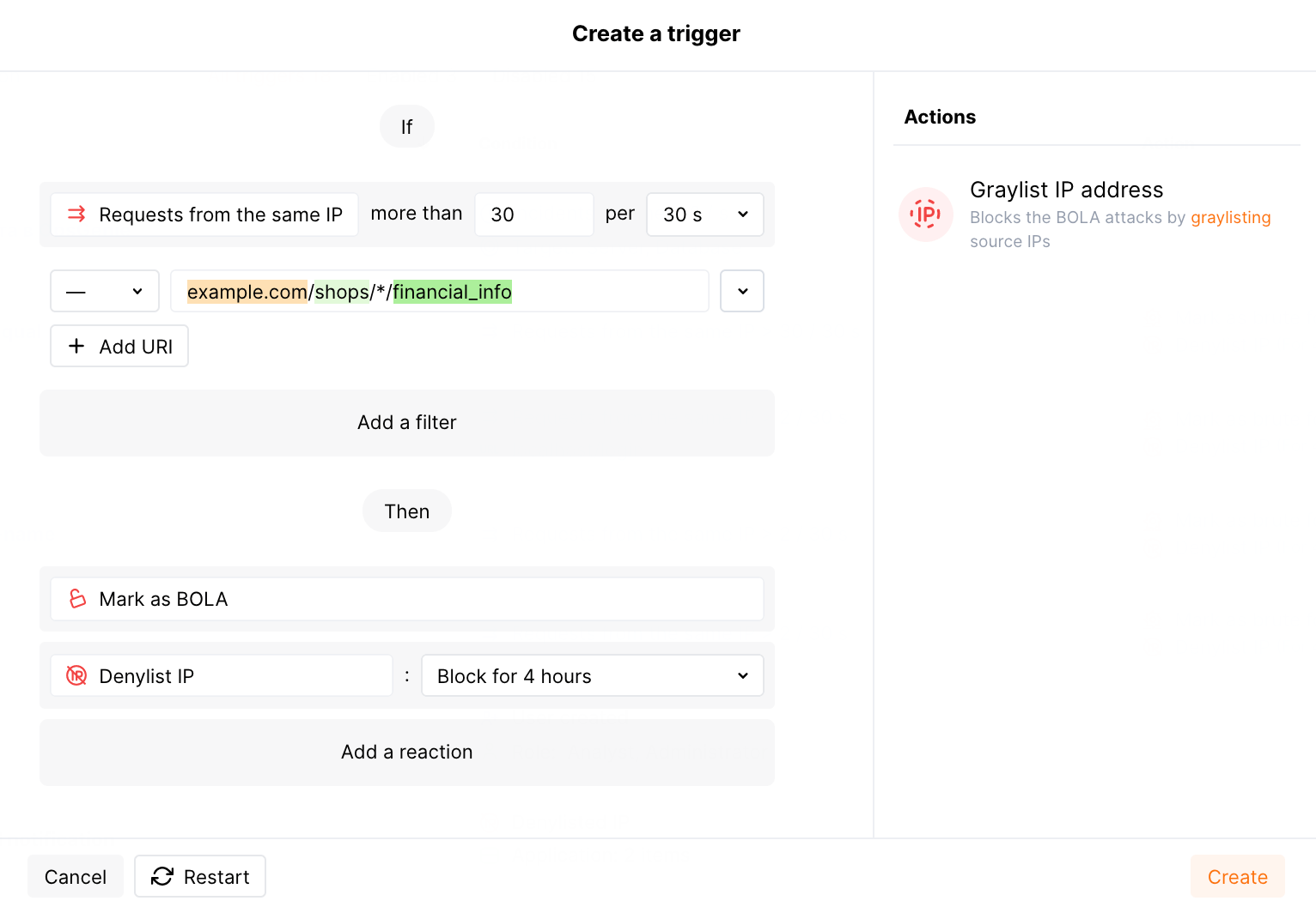 Exemplo do gatilho para detectar e bloquear ataques BOLA direcionados aos dados financeiros da loja (o endpoint da API é https://example.com/lojas/{id_loja}/informacoes_financeiras):