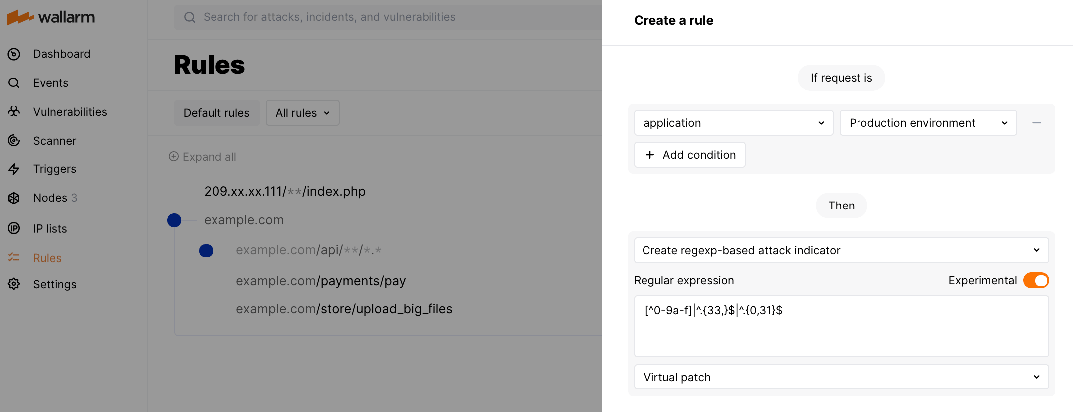 Criar indicador de ataque baseado em regexpno modoExperimental. Este modo permite que a regra seja implantada diretamente no ambiente de produção sem o risco de bloquear erroneamente solicitações válidas do usuário final. -