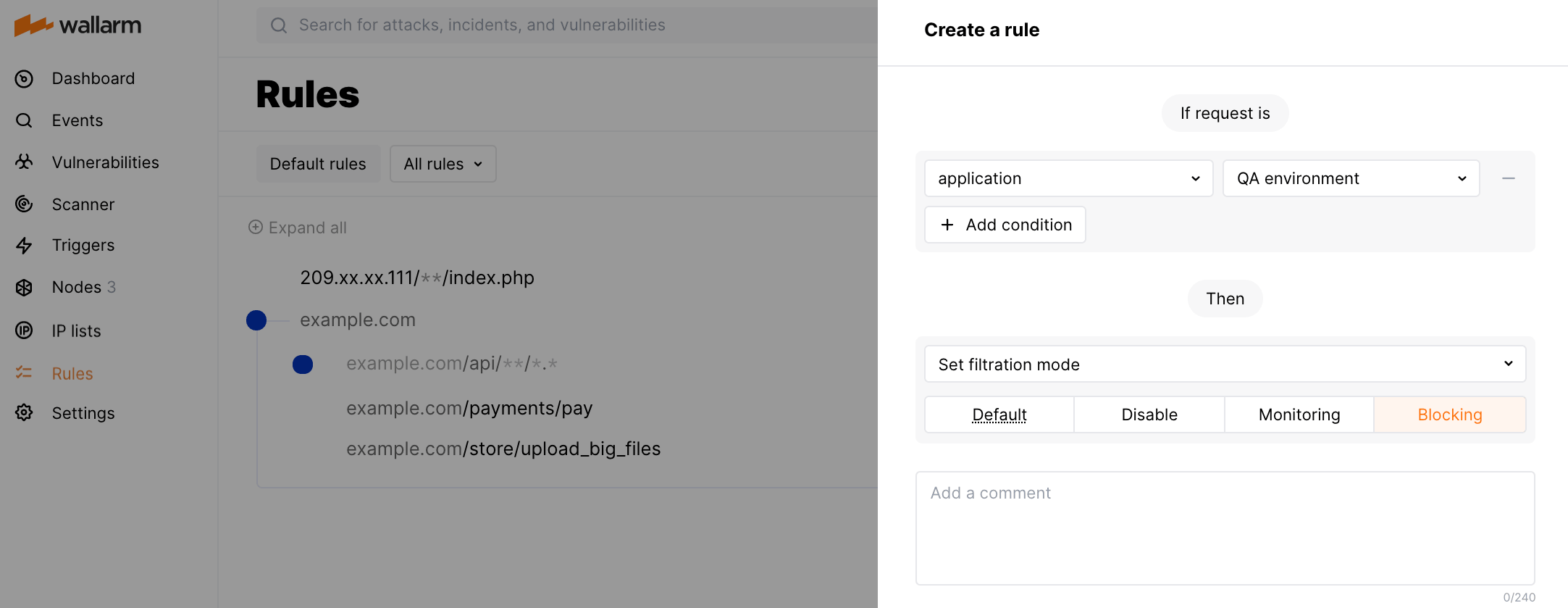 Definir modo de filtragempara controlar o modo de filtragem Wallarm para ambientes e solicitações específicos. Esta regra oferece flexibilidade adicional na forma como a proteção Wallarm pode ser implantada gradualmente para proteger novos endpoints e outros recursos em diferentes ambientes. Por padrão, o valor dewallarm_modeé usado dependendo da configuração dewallarm_mode_allow_override.