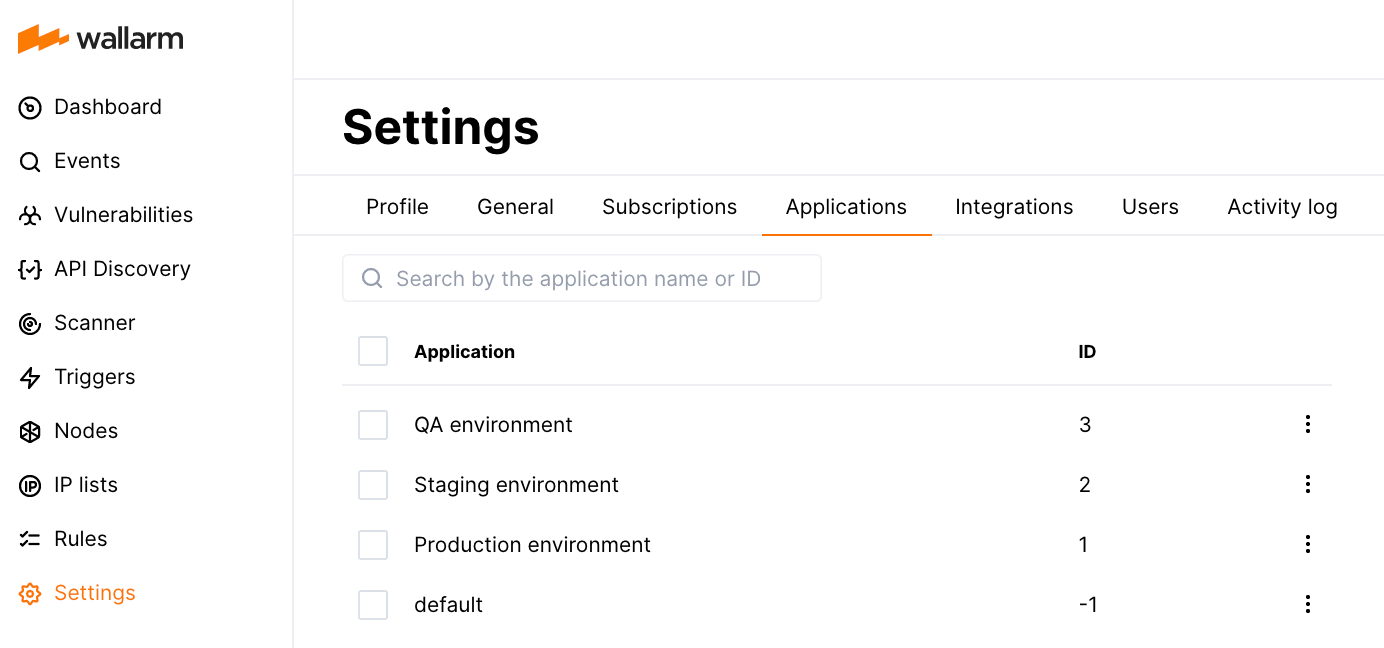 Adicione os nomes dos ambientes e seus IDs em sua conta Wallarm → Configurações → seção Aplicações.