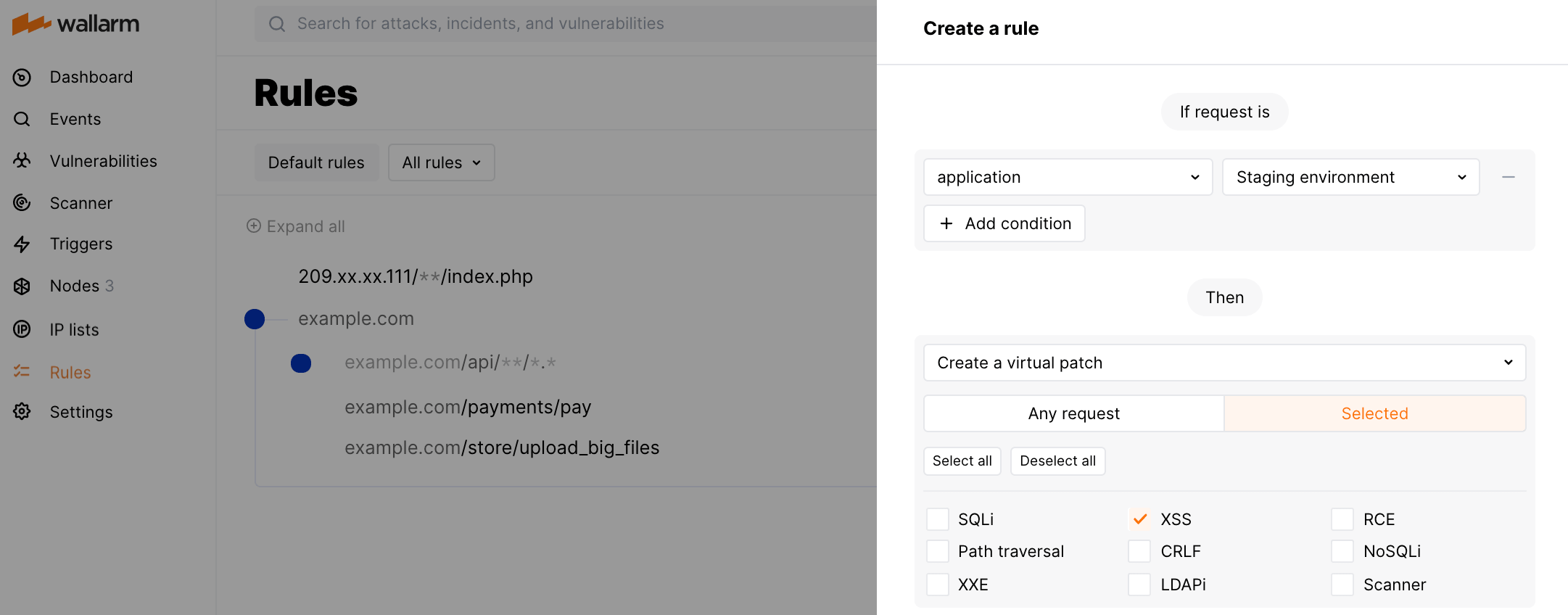 - Todos os nós de filtragem conectados à mesma conta Wallarm receberão o mesmo conjunto de regras de filtragem de tráfego. Você ainda pode aplicar regras diferentes para diferentes aplicações usando os IDs de aplicação apropriados ou cabeçalhos de pedido HTTP únicos.