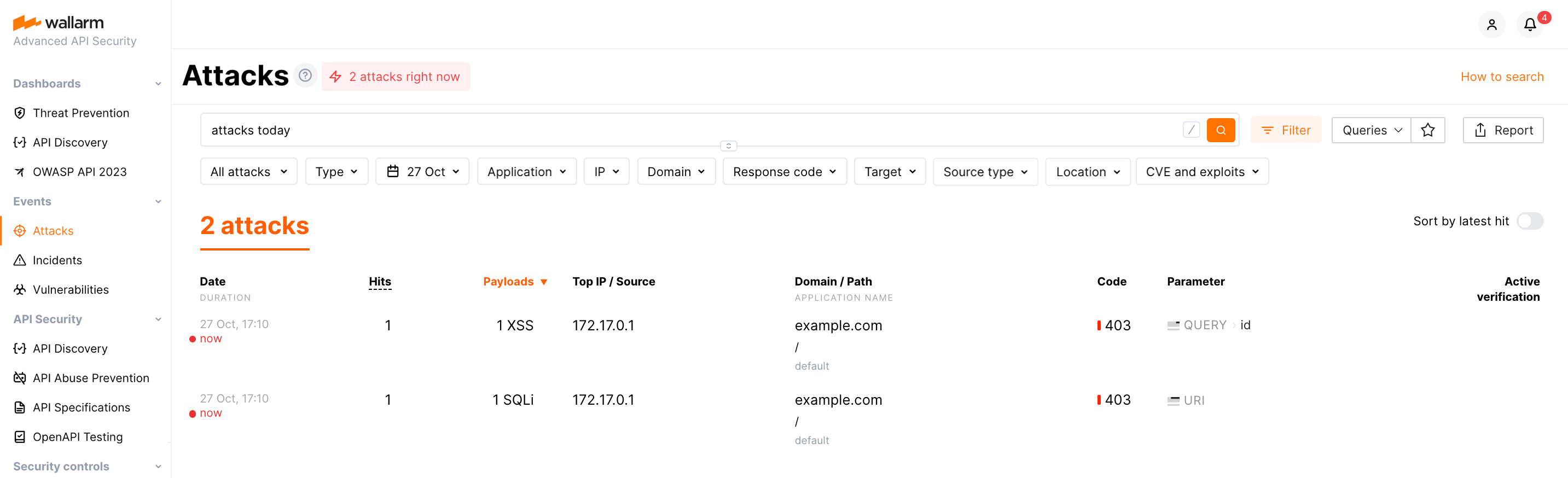 Abra Wallarm Console → seção Events no US Cloud ou EU Cloud e certifique-se de que o ataque está exibido na lista.