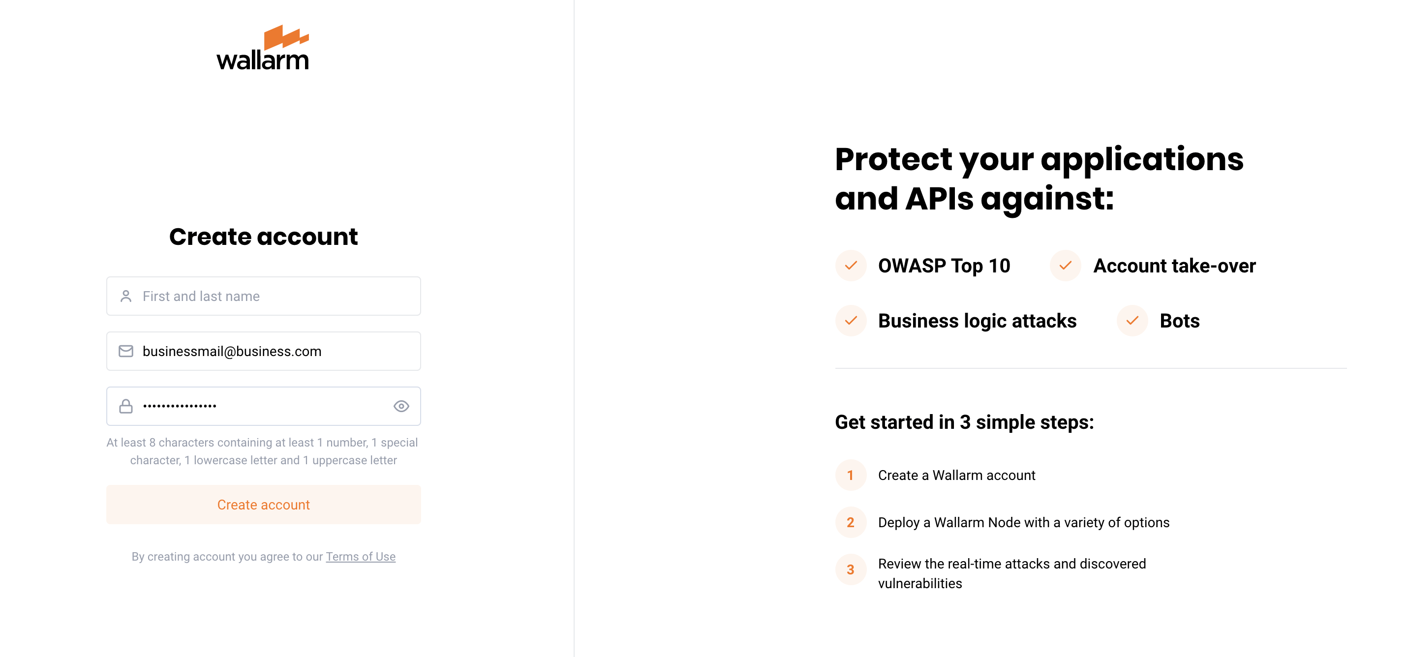 Preencha e confirme o formulário de registro no Console Wallarm na Nuvem US ou Nuvem EU.