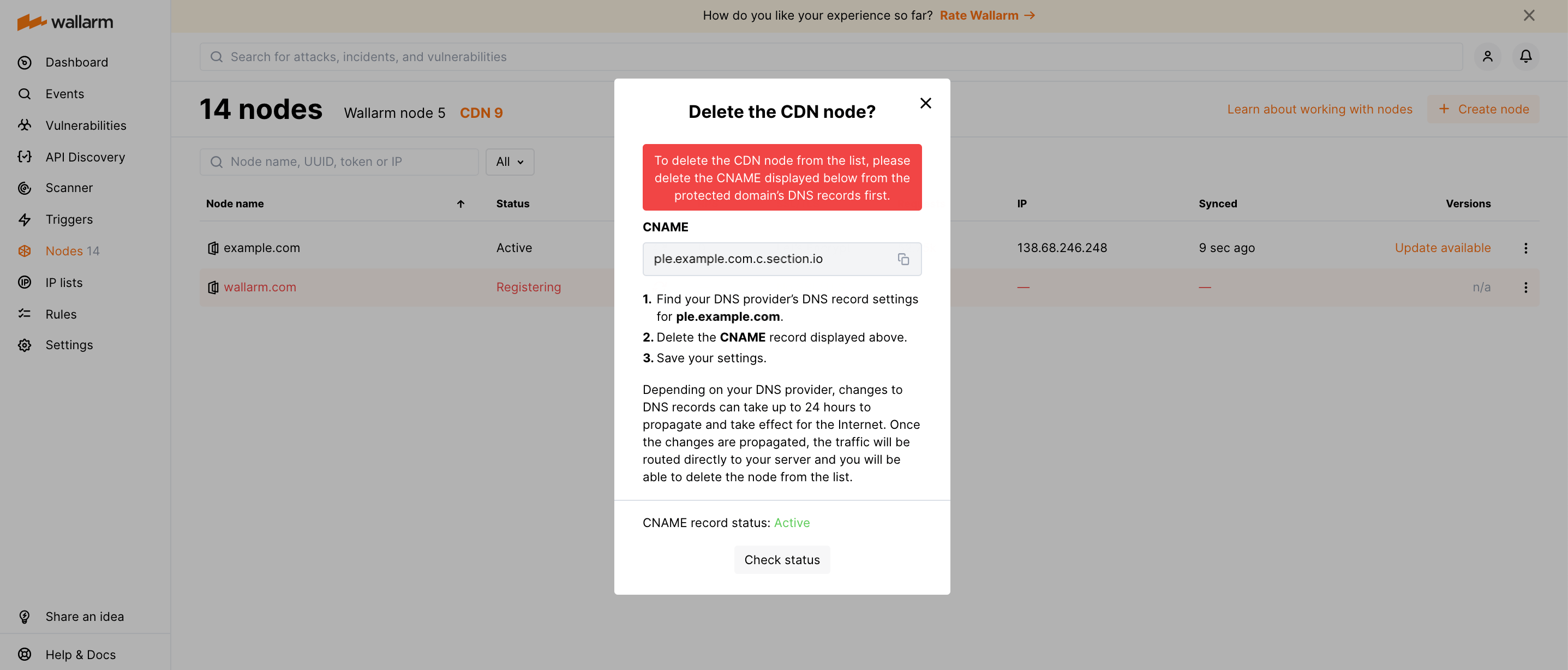 Aguarde a propagação das alterações. O status real do registro CNAME é exibido no Console Wallarm → Nós → CDN → Excluir nó.