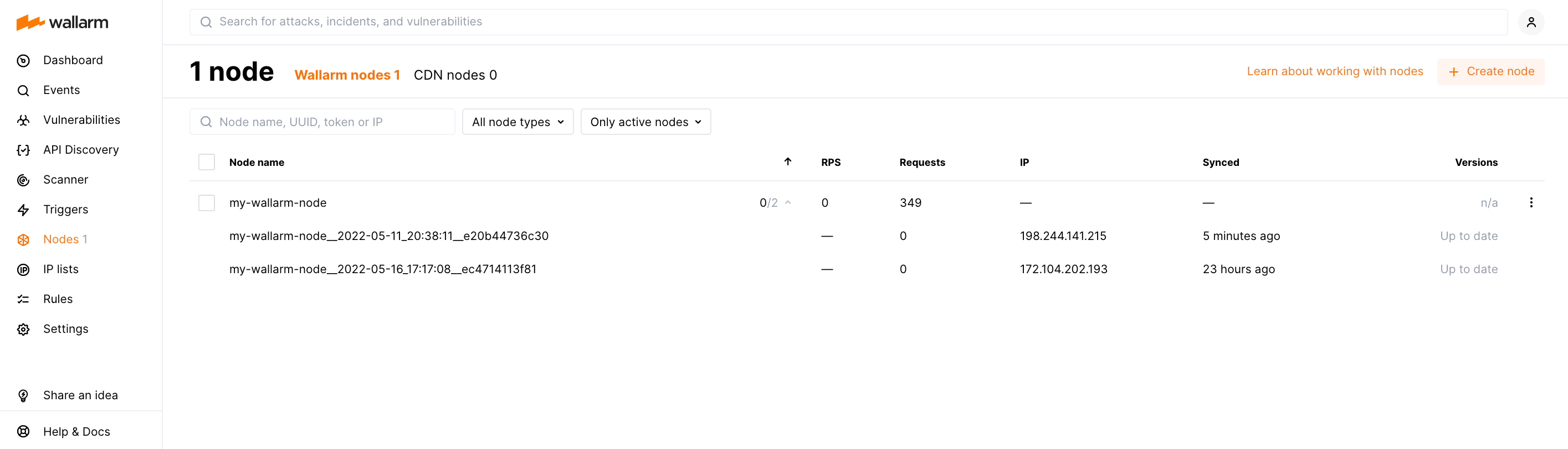 Exclua o nó antigo no console Wallarm → Nós selecionando seu nó e clicando em Excluir.