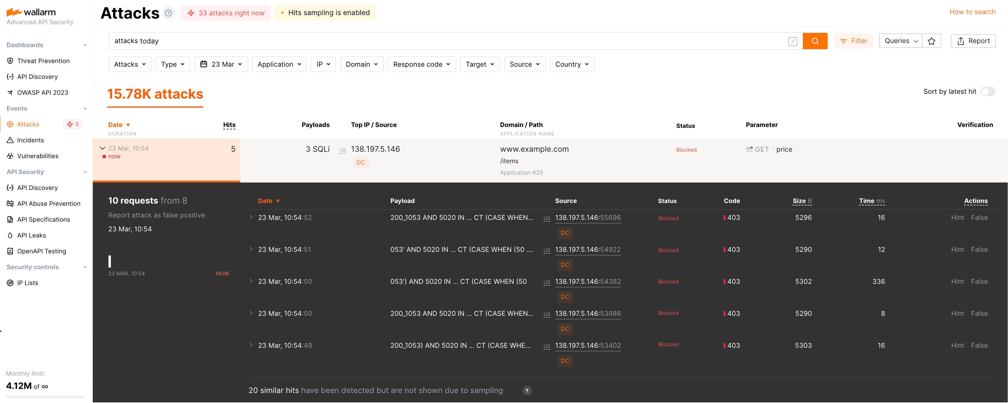 Os primeiros 5 hits idênticos para cada hora são salvos na amostra na Cloud Wallarm. O restante dos hits não é salvo na amostra, mas seu número é registrado em um parâmetro separado.