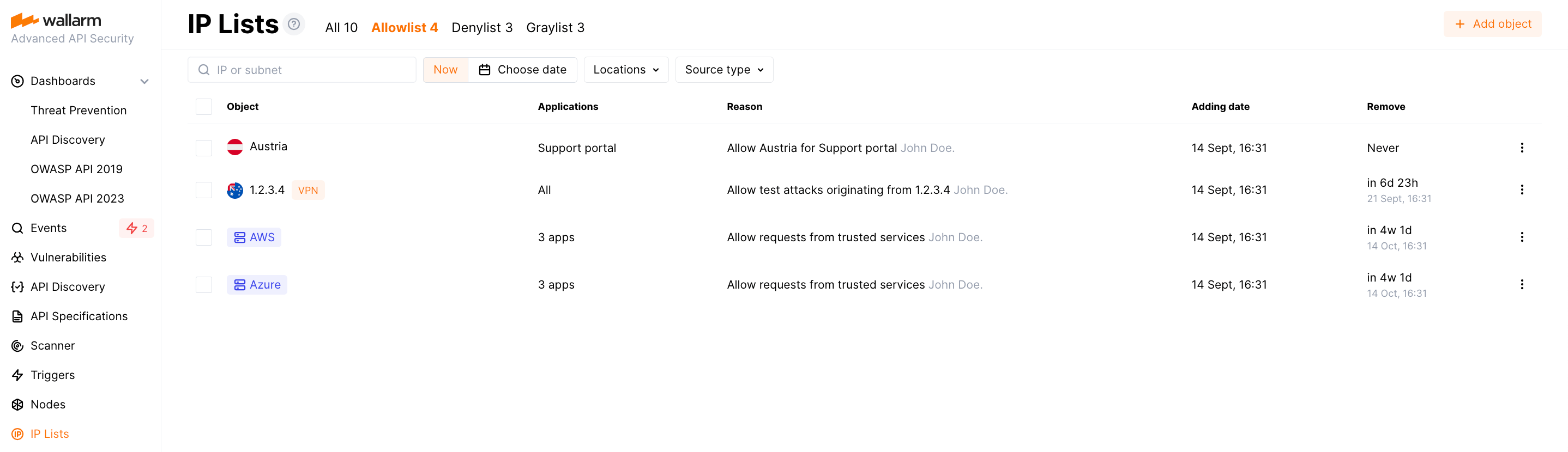 No Console Wallarm → Listas de IP → Lista de permissões, você pode gerenciar endereços IP da lista de permissões da seguinte maneira: