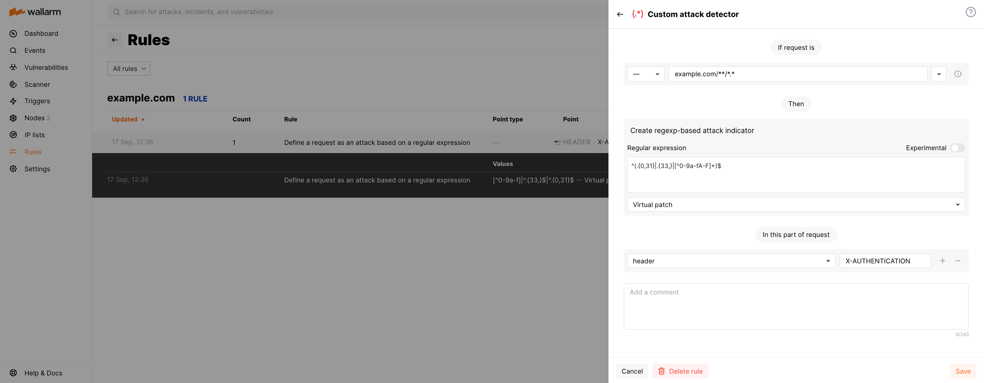Em alguns casos, pode ser útil adicionar uma assinatura para detecção de ataque manualmente ou criar um chamado patch virtual. Como tal, a Wallarm não usa expressões regulares para detectar ataques, mas permite aos usuários adicionar assinaturas adicionais com base em expressões regulares.