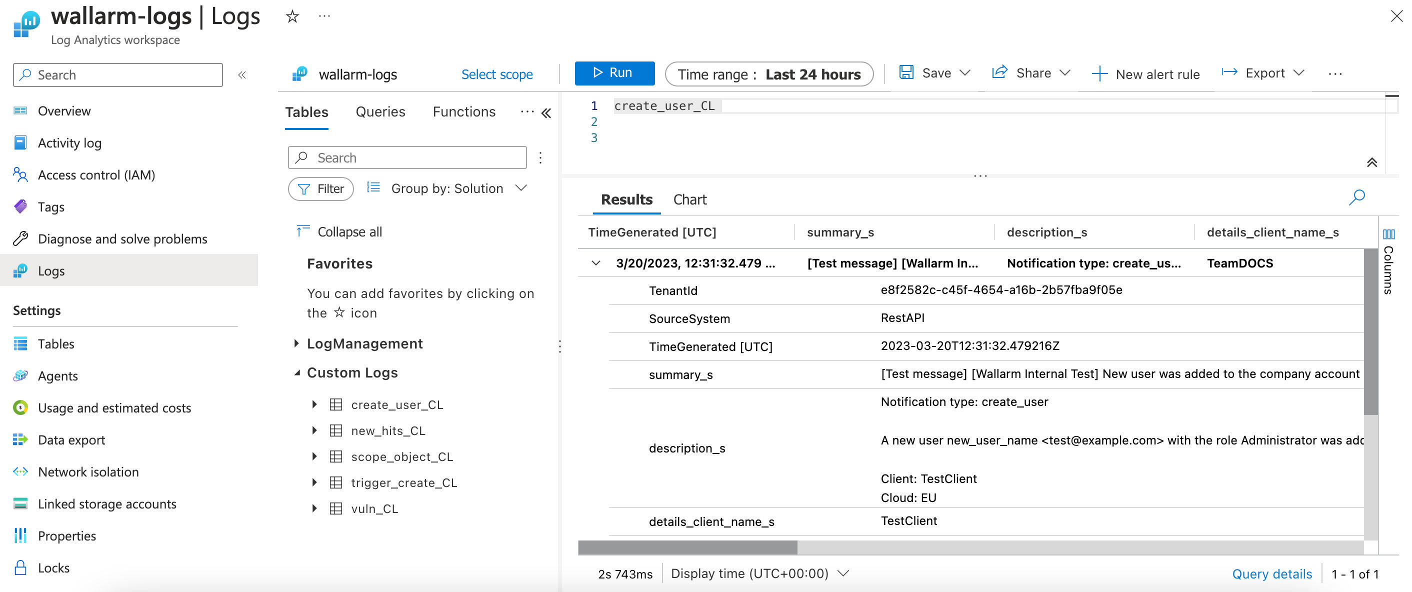 Você pode encontrar os logs do Wallarm em seu Microsoft Workspace → Logs → Log Personalizado, por exemplo, o log de teste