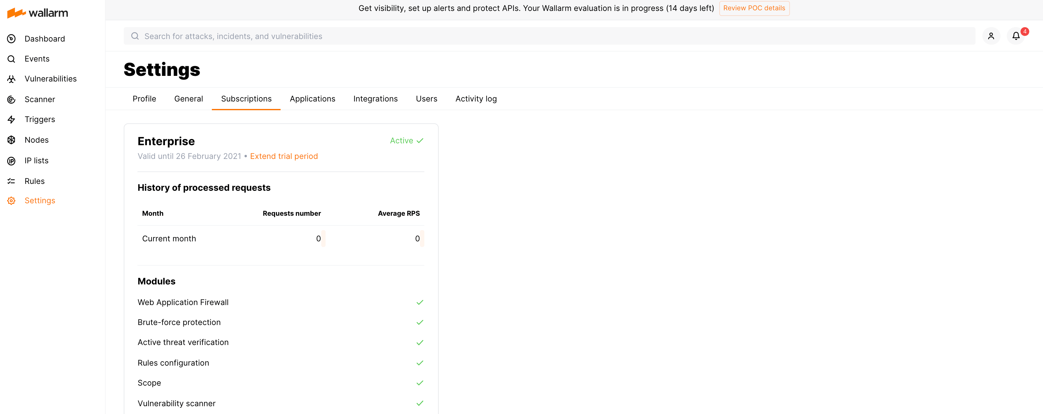 A seção Configurações → Assinaturas do Console Wallarm exibe detalhes do seu plano de assinatura Wallarm.