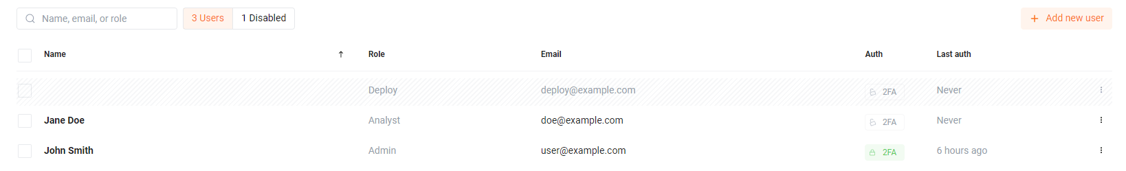 A aba principal Usuários contém todos os usuários da sua empresa registrados na nuvem da Wallarm. Nesta aba, qualquer usuário desativado é realçado em cinza.